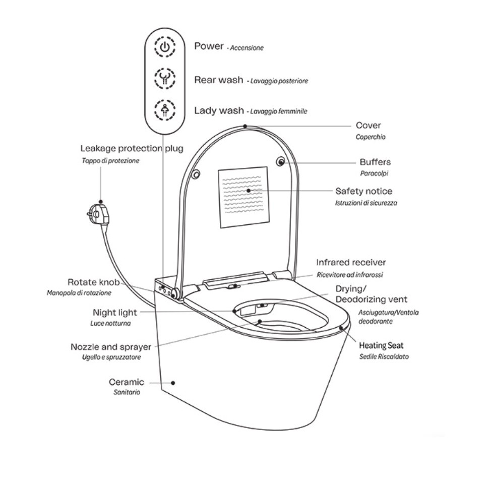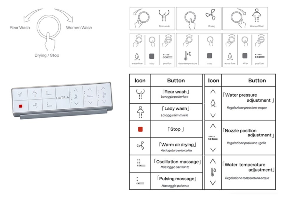 Туалет со встроенным биде полностью автоматизирован: все функции управляются с помощью удобного пульта дистанционного управления или с боковой панели. Крышка сиденья, объединяющая в себе все основные инновационные функции, доступные сегодня, элегантна и компактна: эстетика и размеры полностью соответствуют размерам традиционного унитаза. H-Smart, в дополнение к классической гигиене с возможностью регулирования интенсивности и температуры струи воды, обеспечивает функцию сушки, также с регулируемыми интенсивностью и температурой воздушного потока, дезодорацию, подогрев сиденья с регулируемой температурой и внутреннее теплое освещение для для ночного использования.